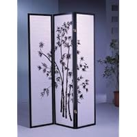 Beautiful black wood framed divider/screen with etched oriental bamboo design. Gain additional privacy by dividing up a room or use as a decorative accent piece. Also great in the bedroom to create a private dressing area. The wood trim is solid with etched bamboo shoji paper insert. Shoji is a translucent, smooth textured vinyl coated fiberglass that looks like rice paper. This 3 panel screen folds up for easy movement and storage. Great as a gift. No assembly required. New in Box.70" tall x 54" wide.